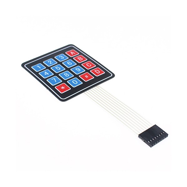 Este es un teclado matricial sencillo para introducción de datos numéricos, tiene 16 botones y están ordenados con una disposición 4x4, que es la ordenación más común en la actualidad. Está hecho de una membrana delgada y flexible que podrás colocar donde te venga mejor. Las teclas están todas conectadas a la matriz, así que lo único que necesitarás son 7 pines de tu microcontroladora (3 columnas y 4 filas) para que el teclado funcione.